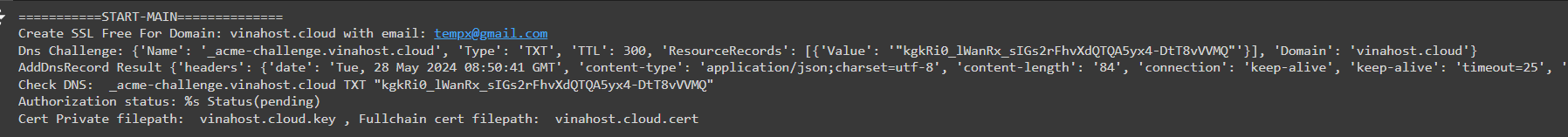 def GenSSLCert(acme_client,domainName,emailAddress,accessKey, secretKey): KEY_FILE = domainName + '.key' #Binary File CSR_FILE = domainName + '.csr' CERT_FILE= domainName + '.cert' #Full Chain.pem print("Create SSL Free For Domain:",domainName,"with email:",emailAddress) pkey, csr= genCSR(domainName,emailAddress) orderr = acme_client.new_order(csr.public_bytes(serialization.Encoding.PEM)) authz_list = orderr.authorizations for authz in authz_list: # Choosing challenge. # authz.body.challenges is a set of ChallengeBody objects. for item in authz.body.challenges: if isinstance(item.chall, challenges.DNS01): r_authz = authz dns_challenge = item dns_txt_value=dns_challenge.validation(acme_client.net.key) if domainName != r_authz.body.identifier.value: print("Domain Request Error:",r_authz.body.identifier.value) continue parts=r_authz.body.identifier.value.split('.') RR = '.'.join(parts[:-2]) primary_domain='.'.join(parts[-2:]) if(len(parts)>2): DnsRecord ={ 'Name': f"_acme-challenge.{RR}", 'Type': 'TXT', 'TTL': 300, 'ResourceRecords': [{'Value': '"{}"'.format(dns_txt_value)}], 'Domain':f"{primary_domain}" } else: DnsRecord ={ 'Name': "_acme-challenge", 'Type': 'TXT', 'TTL': 300, 'ResourceRecords': [{'Value': '"{}"'.format(dns_txt_value)}], 'Domain':f"{primary_domain}" } print("Dns Challenge:", DnsRecord) result=addDnsRecord(accessKey,secretKey,DnsRecord['Domain'],"TXT",DnsRecord['Name'],DnsRecord['ResourceRecords'][0]['Value']) print("AddDnsRecord Result",result) print("Check DNS: ",DnsRecord['Name']+DnsRecord['Domain'],"TXT",DnsRecord['ResourceRecords'][0]['Value']) sleep(30) try: acme_client.answer_challenge(dns_challenge, dns_challenge.response(acme_client.net.key)) rauthz = acme_client.poll(r_authz) print('Authorization status: %s', rauthz[0].body.status) order = acme_client.poll_and_finalize(orderr) cert = order.fullchain_pem with open(CERT_FILE, "wt") as f: f.write(cert) print("Cert Private filepath: ",KEY_FILE,", Fullchain cert filepath: ",CERT_FILE) return cert except acme_errors.ValidationError: print("Validation failed. Please check your DNS record") return 0 - Mẫu sử dụng hàm này như sau: