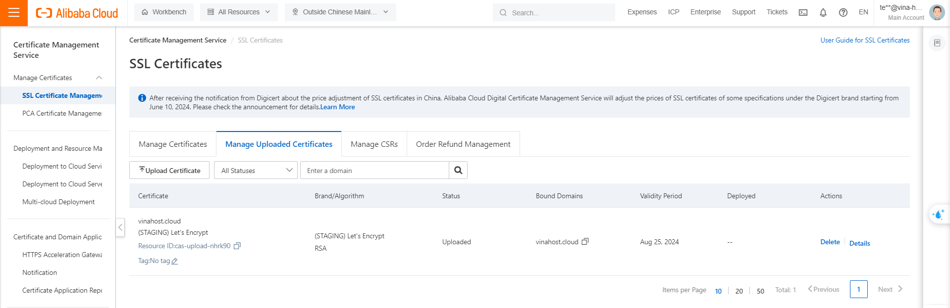 def UploadUserCertToCAS(AccessKey,SecretKey,CertPem,PrivatePem,CACertPem,DomainName): # Endpoint: https://api.alibabacloud.com/product/cas. # Enpoint: <product iD><region><aliyuncs.com> , exam: cas.ap-southeast-1.aliyuncs.com (Outside China Mainland) config = open_api_models.Config( access_key_id=AccessKey, access_key_secret=SecretKey, region_id="ap-southeast-1" ) config.endpoint = f'cas.ap-southeast-1.aliyuncs.com' cas_client = casClient(config) key_data=PrivatePem cert_data=CertPem ca_data=CACertPem upload_cert_request = cas_20200407_models.UploadUserCertificateRequest( cert=cert_data, key=key_data, sign_cert=ca_data, name=DomainName, ) try: response= cas_client.upload_user_certificate_with_options(upload_cert_request, util_models.RuntimeOptions()) print("Upload Cert to Alibaba Cloud Certificate Management Service Success") with open("CERT_ID_MAP.txt","a") as f: cert_id_record=DomainName +" " + str(response.body.cert_id) + "\n" f.write(cert_id_record) print(response.body.cert_id) return response.body.cert_id except Exception as error: print(error) def main(): print("===========START-MAIN==============") AccessKey='XXXXXX' SecretKey='XXXXXXXXXXXXXXXXXXXXXx' domainName='vinahost.cloud' with open('vinahost.cloud.cert', "rt") as f: cert_file=f.read() cert_pem,ca_pem=SplitFullChainPem(cert_file) pri_pem=LoadPrivateKeyAsText('vinahost.cloud.key') cert_id=UploadUserCertToCAS(AccessKey,SecretKey,cert_pem,pri_pem,ca_pem,domainName) main() - Sau khi hoàn tất, có thể kiểm tra trên giao diện phần "hallenge,", nếu code báo thành công, nhưng không thấy chứng chỉ trên giao diện, có thể chọn sang Region khác (ví dụ: Chinese Mainland). Nếu chứng chỉ được upload, nhưng không nằm ở region mong muốn, có thể thiết lập lại endpoint phù hợp hơn.